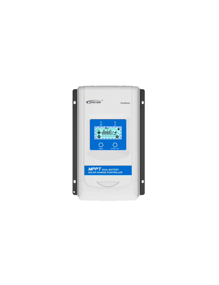 Το DuoRacer MPPT charge controller είναι κατασκευασμένο για να φορτίζει δύο μπαταρίες (παρουσιάζονται ως κυρίως μπαταρία (BATT1) και μπαταρία εκκίνησης (BATT2) παρακάτω) ταυτόχρονα σε ηλιακό σύστημα. Αυτό το controller υποστηρίζει πολλών ειδών κυρίως μπαταρίας (BATT1) όπως Sealed, Gel, Flooded, LiFePO4 και Li-NiCoMn, που είναι κατάλληλες για RV, Camper, πλοία κ.α.. Η συσκευή αναγνωρίζει αυτόματα τη τάση του συστήματος της μπαταρίας εκκίνησης (BATT2) και φορτίζει με μειωμένο ρεύμα την μπαταρία στις ανάλογες συνθήκες.