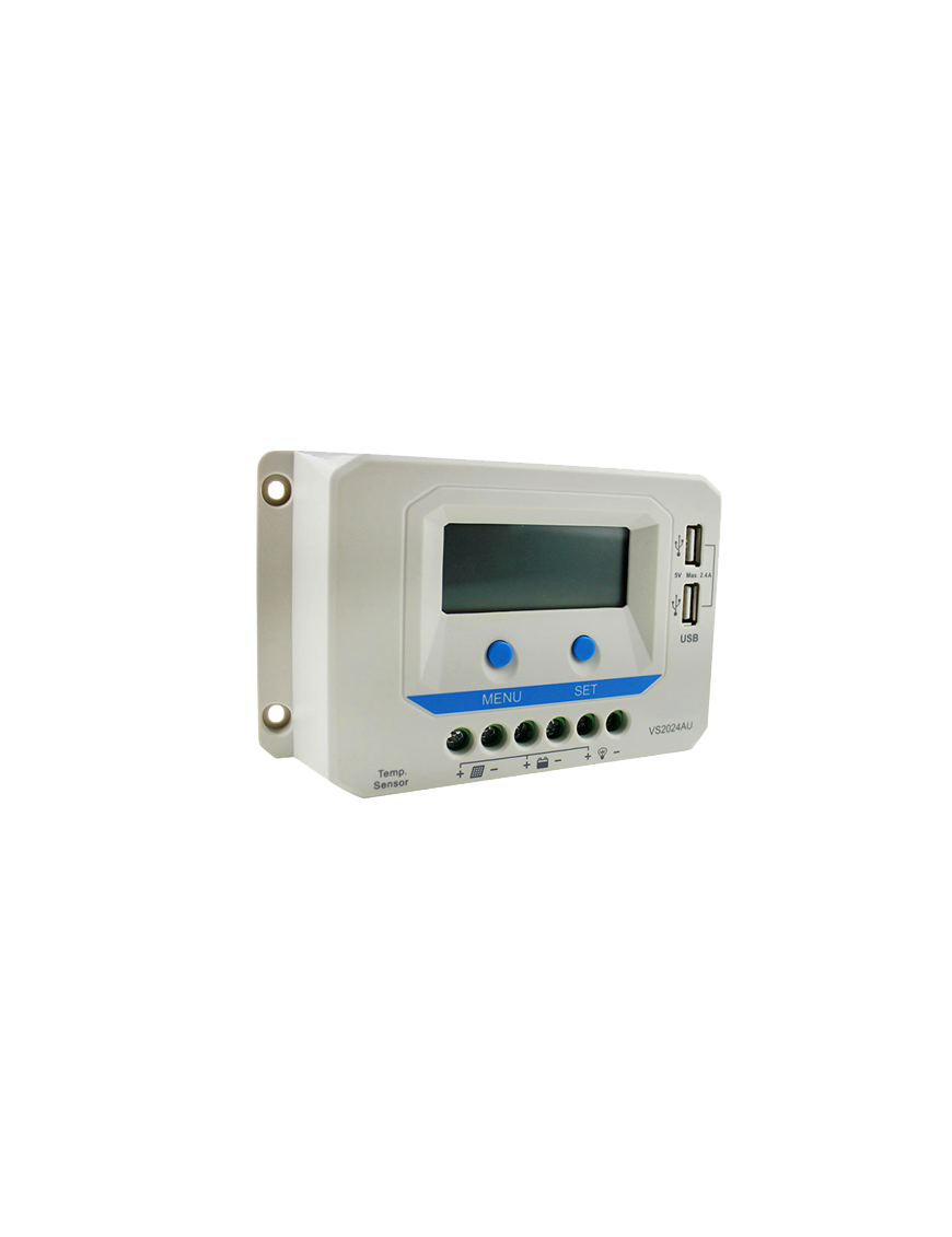 Ρυθμιστής φόρτισης 20Α από την EPsolar με οθόνη LCD. Κατάλληλος για αυτόνομα συστήματα 12V / 24V. Η νέα σειρά ρυθμιστών VS-AU εκπληρώνουν καλύτερα τις απαιτήσεις των συστημάτων, διαθέτουν διπλή έξοδο USB για οποιαδήποτε χρήση, μεγάλη οθόνη LCD ώστε να μπορείτε να ενημερώνεστε για όλες τις καταστάσεις λειτουργίας με τη χρήση συμβόλων, καθώς και γραφική αναπαράσταση της κατάστασης φόρτισης με χρήση κλίμακας. Άλλα δεδομένα όπως τάση, ρεύμα αναπαρίστανται ψηφιακά.