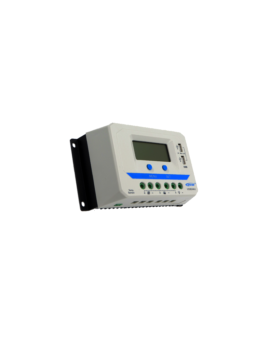 Ρυθμιστής φόρτισης 30Α από την EPsolar με οθόνη LCD. Κατάλληλος για αυτόνομα συστήματα 12V / 24V. Η νέα σειρά ρυθμιστών VS-AU εκπληρώνουν καλύτερα τις απαιτήσεις των συστημάτων, διαθέτουν διπλή έξοδο USB για οποιαδήποτε χρήση, μεγάλη οθόνη LCD ώστε να μπορείτε να ενημερώνεστε για όλες τις καταστάσεις λειτουργίας με τη χρήση συμβόλων, καθώς και γραφική αναπαράσταση της κατάστασης φόρτισης με χρήση κλίμακας. Άλλα δεδομένα όπως τάση, ρεύμα αναπαρίστανται ψηφιακά.