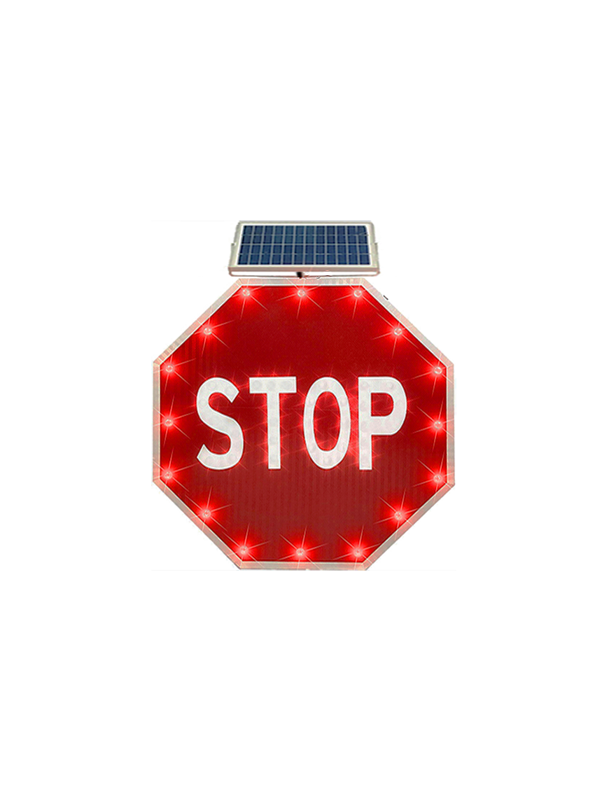Υποχρεωτική διακοπή πορείας (STOP) πινακίδα φωτιζόμενη με LED και με λειτουργία ηλιακής ενέργειας. Περιέχει μία μπαταρία 6Ah των 3,7V και δύο διακόπτες λειτουργίας. Ο κόκκινος διακόπτης ελέγχει το On/Off του STOP ενώ ο μαύρος διακόπτης ελέγχει τον τρόπο λειτουργίας. Στη θέση I το STOP είναι ενεργό για 24 ώρες συνεχόμενα, ενώ στη θέση O ανάβει μόνο το βράδυ για 12 ώρες.