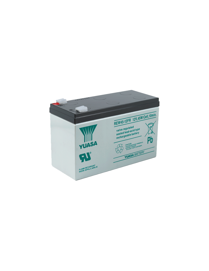Χαρακτηριστικά γνωρίσματα Θαυμάσια αποκατάσταση χωρητικότητας μετά από τη βαθιά εκφόρτιση. Ηλεκτρολύτης με σύστημα αναστολής Σύστημα κυκλοφορίαςαερίων. κατάλληλοι για πολλές χρήσεις. τοποθέτηση σε οποιαδήποτε θέση εκτός από την ανάποδη ( όχι οι πόλοι προς τα κάτω). μεγάλη ενεργειακή χωρητικότητα. Πλέγμα Ασβεστίου μολύβδου για την μεγαλύτερη διάρκεια ζωής και μεγαλύτερη ικανότητα φορτοεκφορτίσεων. Τεχνικά χαρακτηριστικά γνωρίσματα Κλειστού τύπου. Tο μοναδικό σύστημα κατασκευής και σφράγισης των μπαταριών Yuasa εξασφαλίζει ότι δεν θα προκληθεί καμία διαρροή ηλεκτρολυτών στα ups. Σύστημα κυκλοφορίας ηλεκτρολυτών Όλες οι μπαταρίες της σειράς REW, χρησιμοποιούν το μοναδικό σύστημα κυκλοφορίας ηλεκτρολύτη Yuasa . Το διαχωριστικό είναι κατασκευασμένο από ειδικές ίνες γυαλιού, για να διατηρήσει το μέγιστο ποσό ηλεκτρολύτη στα cells. Ο ηλεκτρολύτης διατηρείται στο υλικό του διαχωριστικού και δεν υπάρχει ελεύθερος ηλεκτρολύτης για να διαφύγει από τα cells. Έλεγχος παραγωγής αερίου. Ο σχεδιασμός των μπαταριών του REW Yuasa ενσωματώνει την πολύ πιό πρόσφατη τεχνολογία κυκλοφορίας οξυγόνου για να ελέγξει αποτελεσματικά την παραγωγή του αερίου κατά τη διάρκεια της κανονικής λειτουργίας. Συντήρηση Λόγω της τέλεια σφραγισμένης κατασκευής και της κυκλοφορίας του ηλεκτρολύτη εγκλωβίζει τα αέρια μέσα στο cell και η μπαταρία δεν χρειάζεται καμία συντήρηση. ValveRegulated Design( σχεδιασμός ρυθμιζόμενης βαλβίδας ) Οι μπαταρίες είναι εξοπλισμένες με ένα απλό, ασφαλές σύστημα εξαερισμού χαμηλής πίεσης που απελευθερώνει το υπερβολικό αέριο αν υπάρξει πρόβλημα αύξησης της πίεσης και αυτόματα ξανά σφραγίζει την μπαταρία. Εφαρμογές Οι μπαταρίες YUASA REW45-12 είναι κατάλληλες και για χρήση stand by και για κυκλική χρήση, όπως UPS, συναγερμοί, κάμερες.