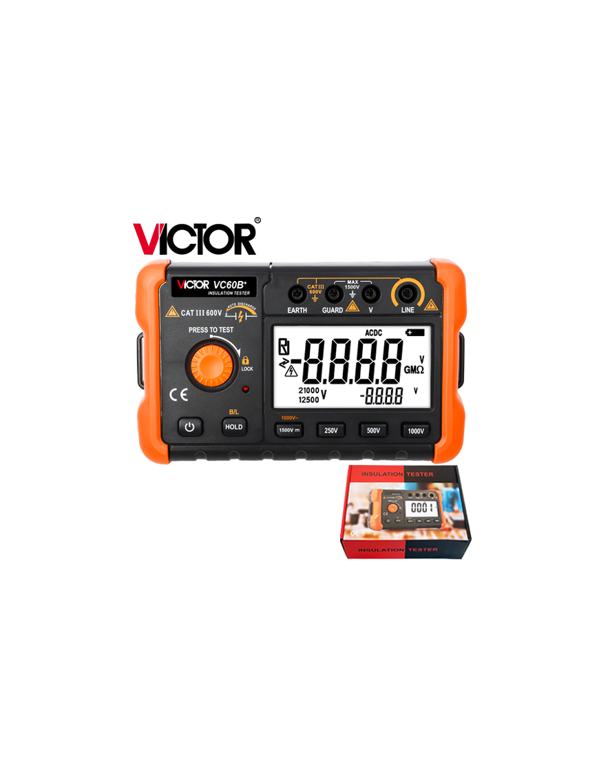 Αυτό το όργανο υιοθετεί μετατροπέα DC τάσης χαμηλής κατανάλωσης και υψηλής μετατροπής με αποθήκευση ενέργειας μέσω επαγωγής, για να μετατρέπει την τάση των 9V σε 250V/500V/1000V (VC60B+), 1000V/2500V (VC60D+), 2500V/5000V (VC60E+) DC τάση. Χρησιμοποιεί ψηφιακή γέφυρα για να επιτυγχάνει τη μέτρηση της αντίστασης μόνωσης, με χαρακτηριστικά την εύκολη χρήση, ευρύ φάσμα μετρήσεων, οθόνη με οπίσθιο φωτισμό, διατήρηση δεδομένων και αυτόματη απενεργοποίηση. Το όργανο αυτό έχει σταθερότητα στην απόδοση και μπορεί να λειτουργήσει και με τα δύο χέρια χρησιμοποιώντας έναν ιμάντα ώμου. Είναι ιδανικό για τις ανάγκες ελέγχου αντίστασης μόνωσης, όπως σε ηλεκτρικά συστήματα, καλώδια, ηλεκτρομηχανολογικό εξοπλισμό, τηλεπικοινωνιακό εξοπλισμό και ηλεκτρικές εγκαταστάσεις.